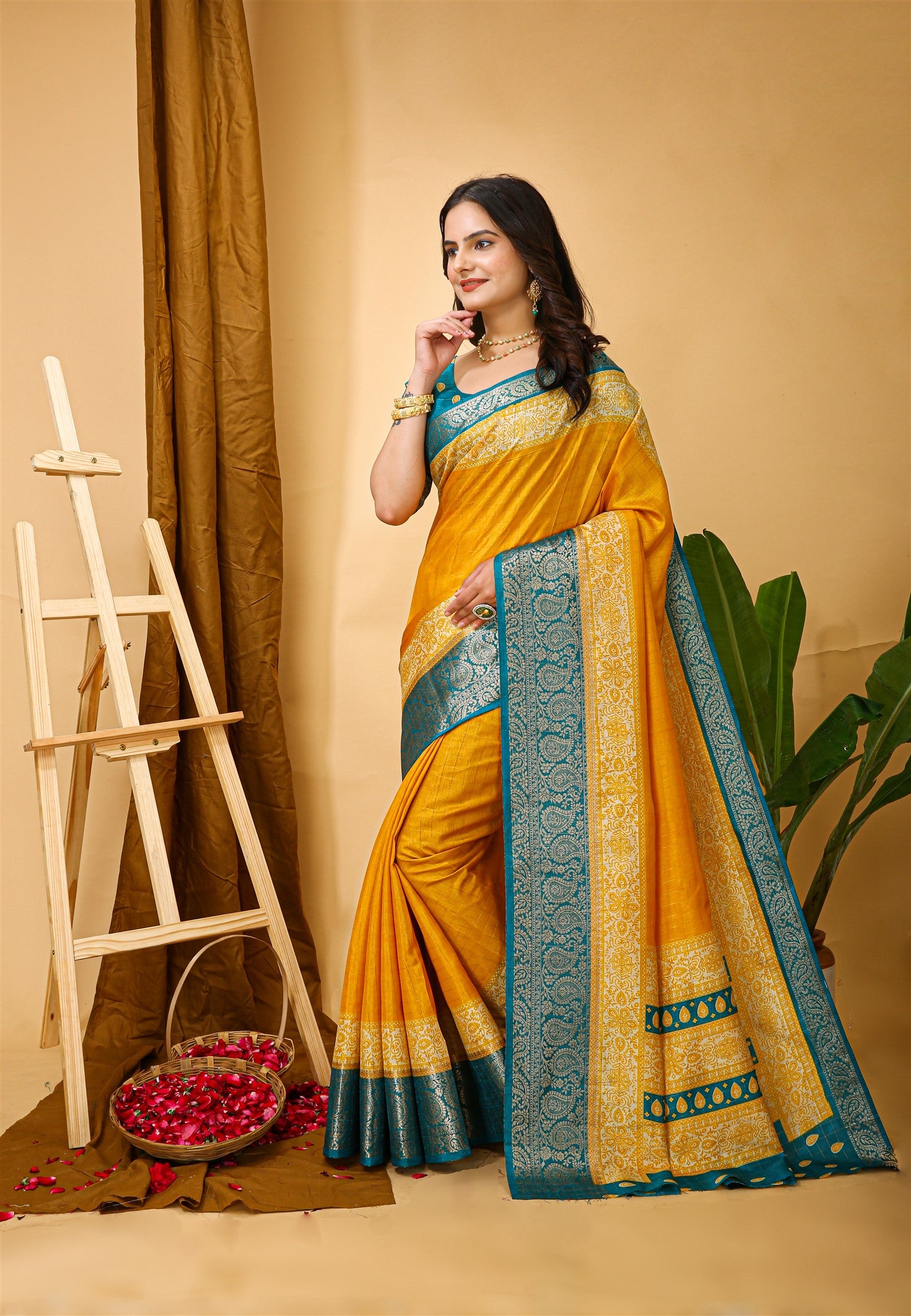 Yellow Color Cotton Silk Fabric with Kalamkari print with Kanjivaram Saree